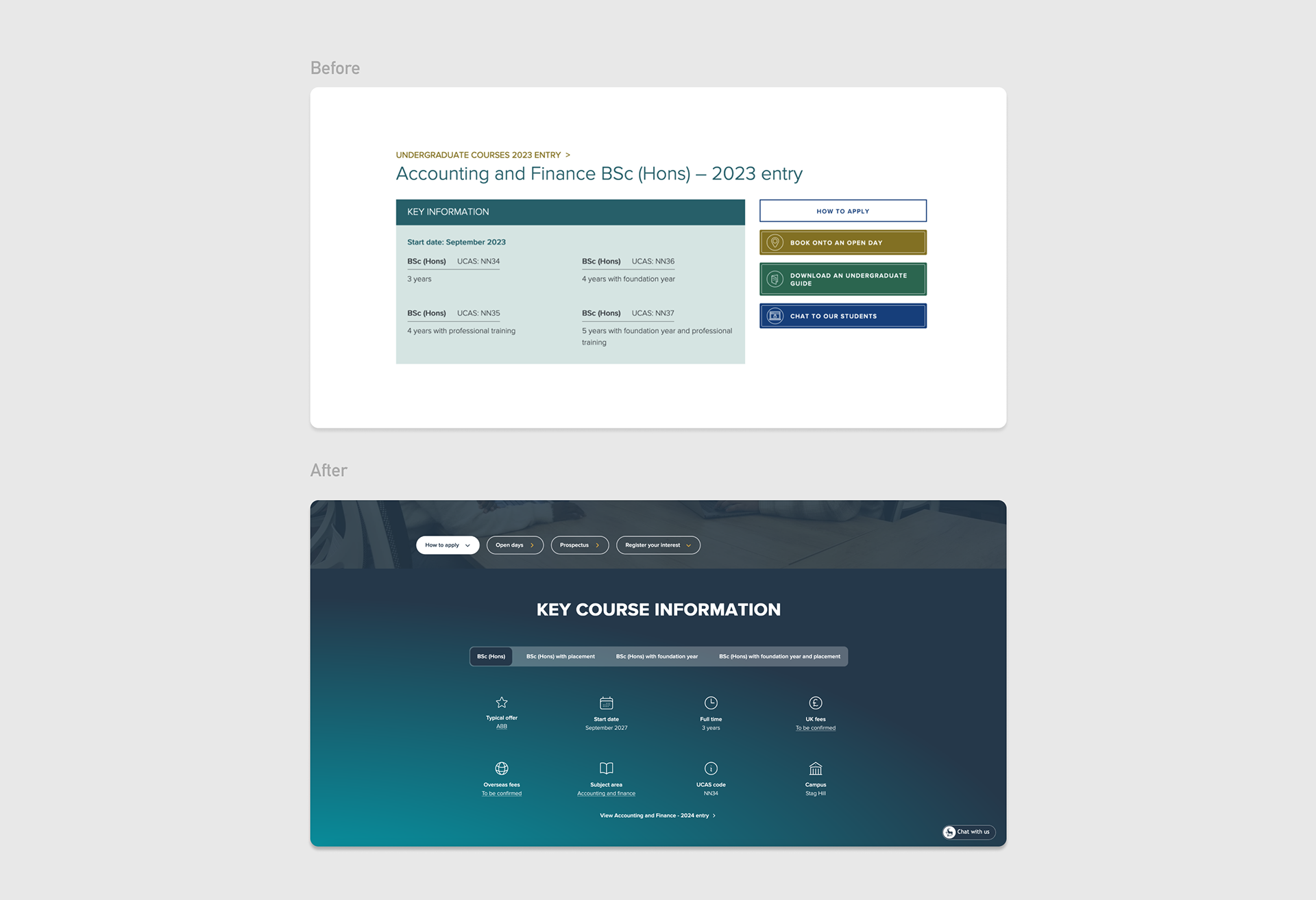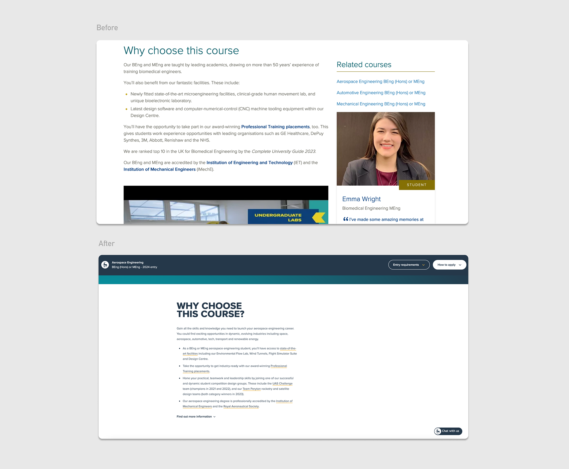 On the course pages, I reorganised the key information box and simplified the content to reduce cognitive load, improving accessibility, readability, and the overall user experience.