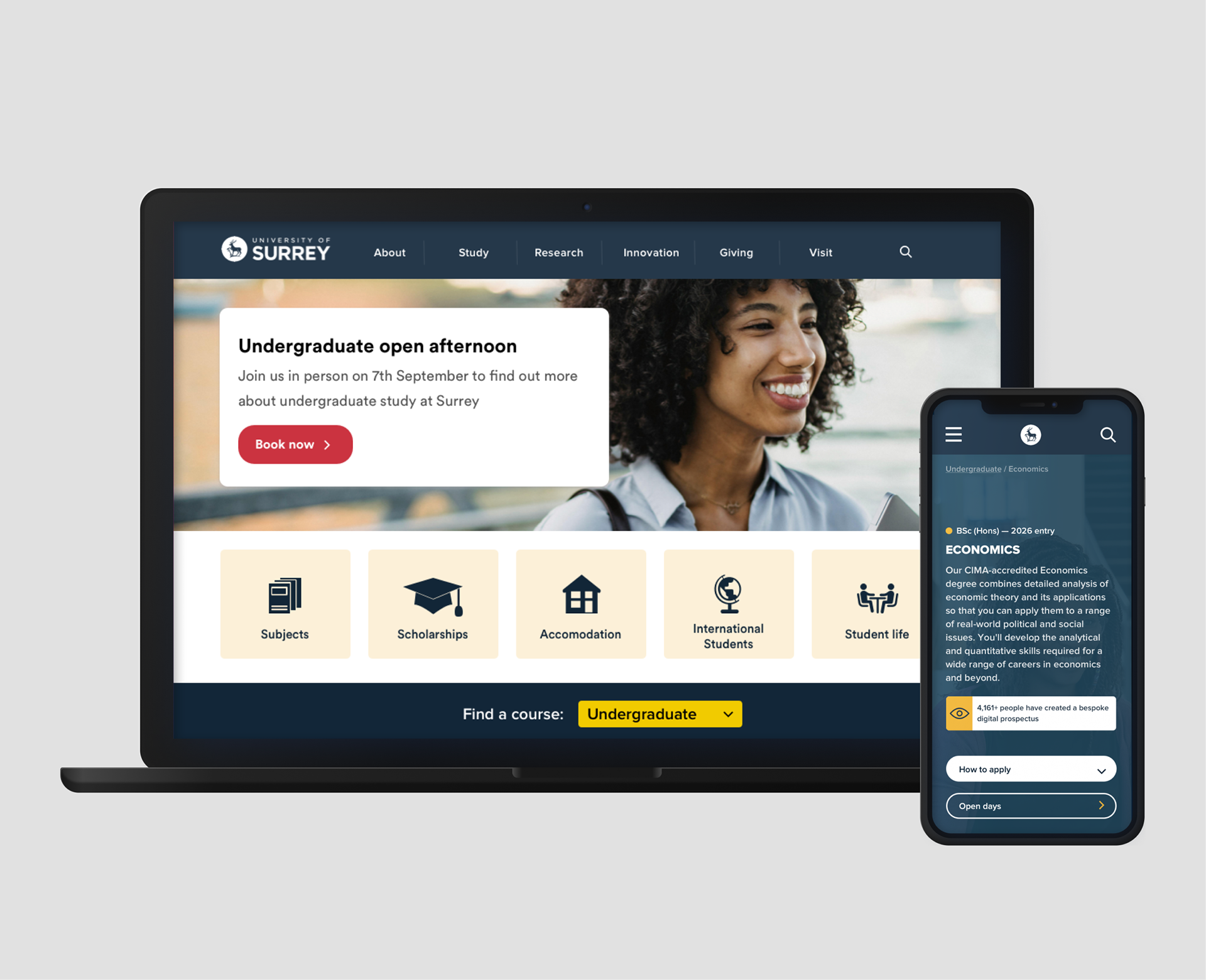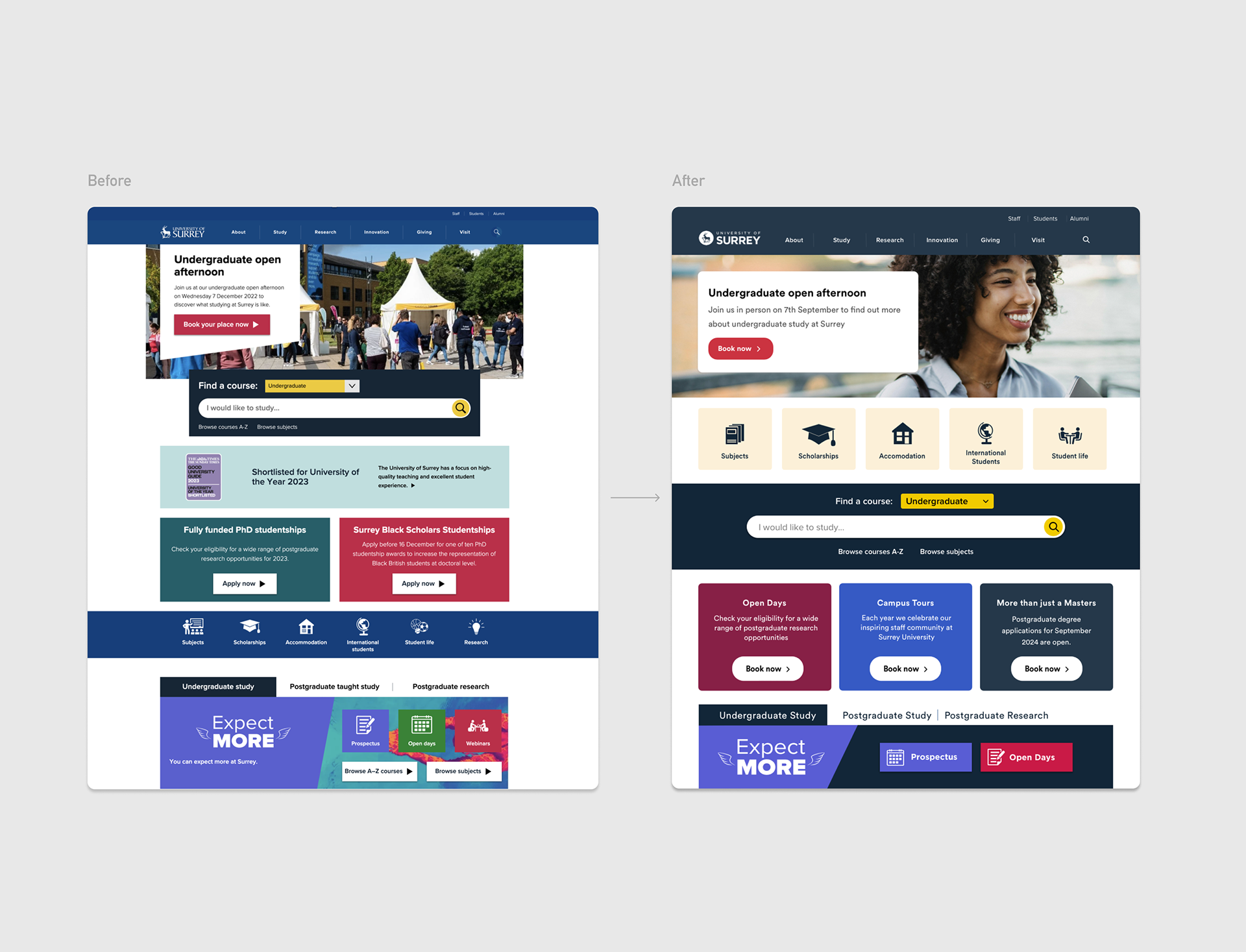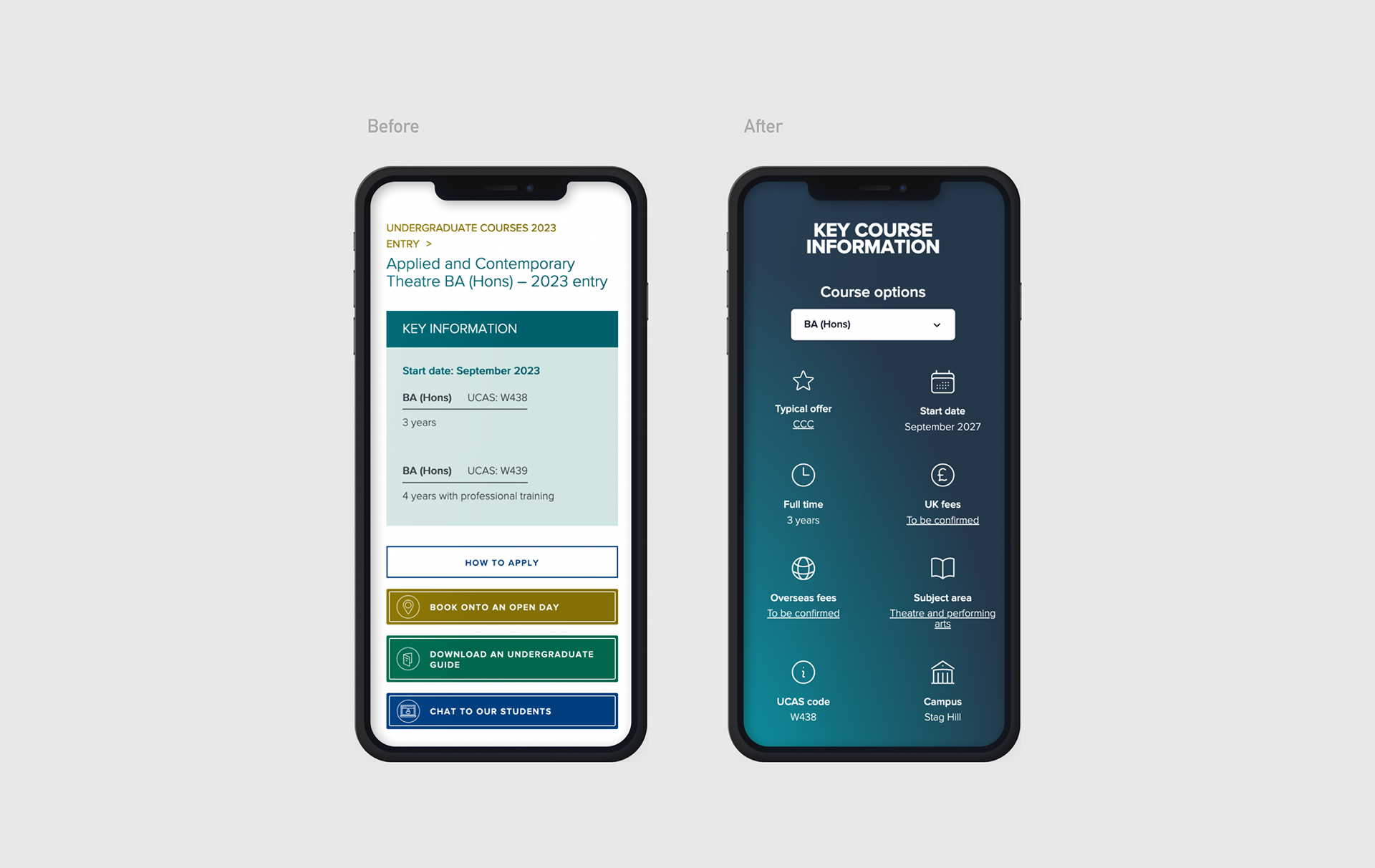 The University of Surrey hired me as a UX/UI consultant to optimise the online experience UI. I worked independently with content, analytics and development teams to test new features and implement improvements across web and mobile platforms.