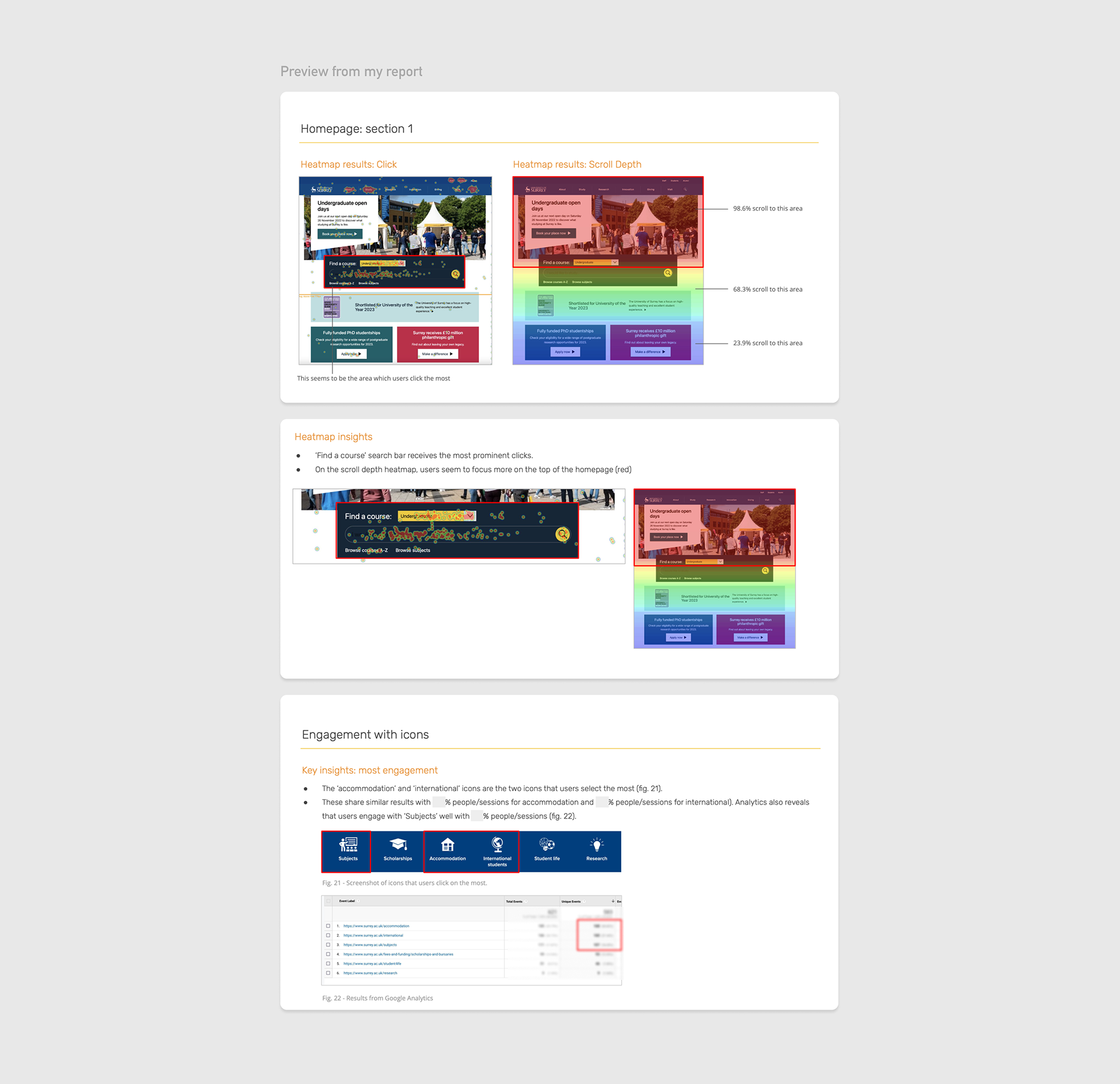 Click map results showed that the majority of engagement happened at the top of the page. However, results from Google Analytics showed that a high percentage of students were scrolling down to click on the blue bar with icons to access pages such as 'subjects', 'accommodation' and 'international students'.